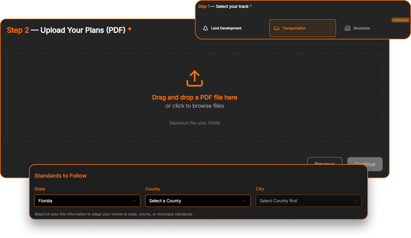Select your track and location, upload your plans, and receive a QC review aligned with your required standards - in seconds.