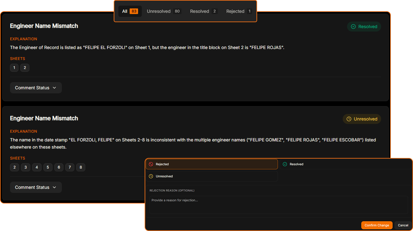 For every completed review, you can access all AI-generated comments. You and your team members can update their status collaboratively.